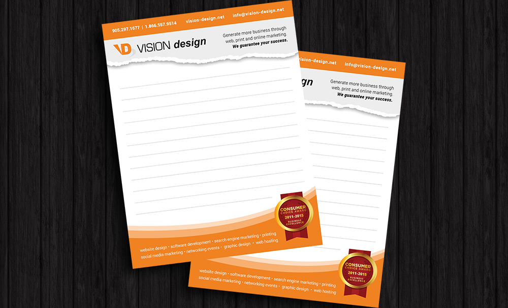 From personal experience, we know that notepad printing can be a huge asset to your business. When you hand or mail out custom printed notepads, it gives your customers and clients something that they can use on a daily basis. This strengthens the image of your brand over a prolonged period of time. Vision Design & Print strongly recommends having notepads printed and distributed to both your existing and potential customer bases. Notepad printing, letterhead printing and envelope printing all allow your business to promote itself in a non-threatening, passive manner. Notepads are an excellent business tool.